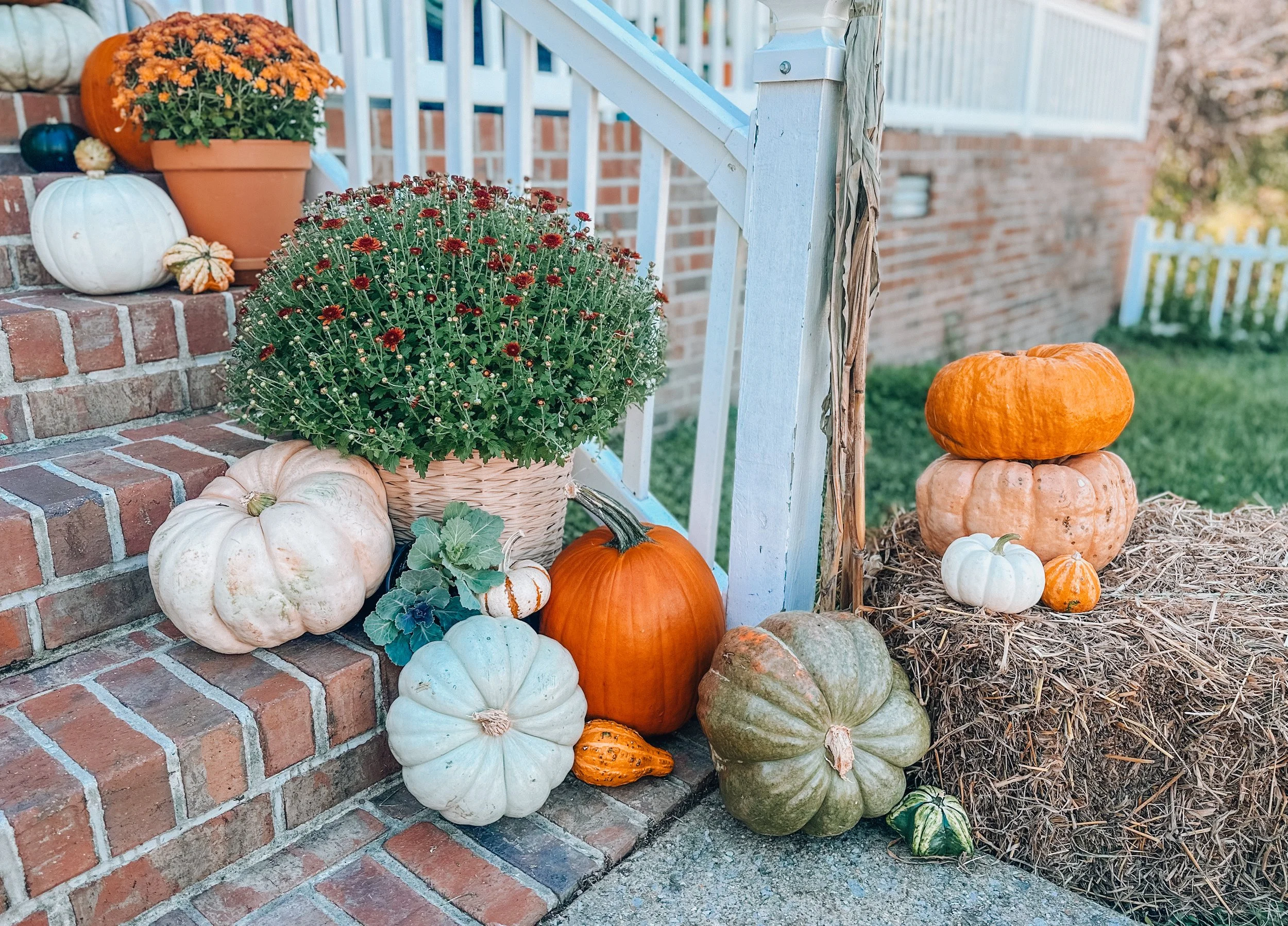 A custom design curated to fit your porch and decor aesthetic. Typically, 100 or more specialty pumpkins and gourds are used, along with other decor elements, if desired.